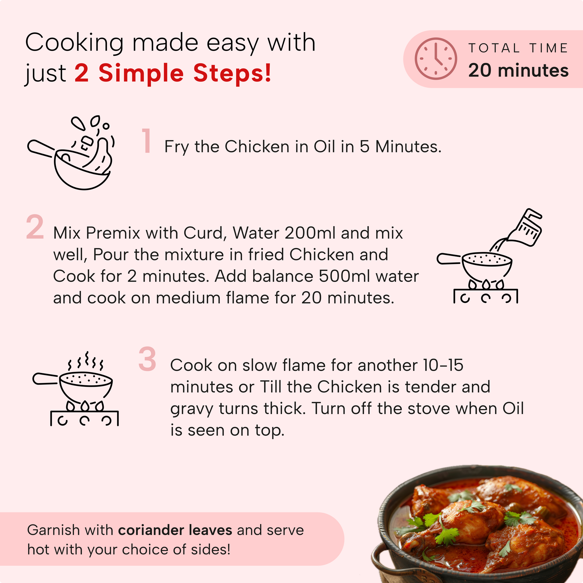 • Mix Premix with Curd, Water 200ml, and mix well, Pour the mixture into the fried Chicken and Cook for 2 minutes.